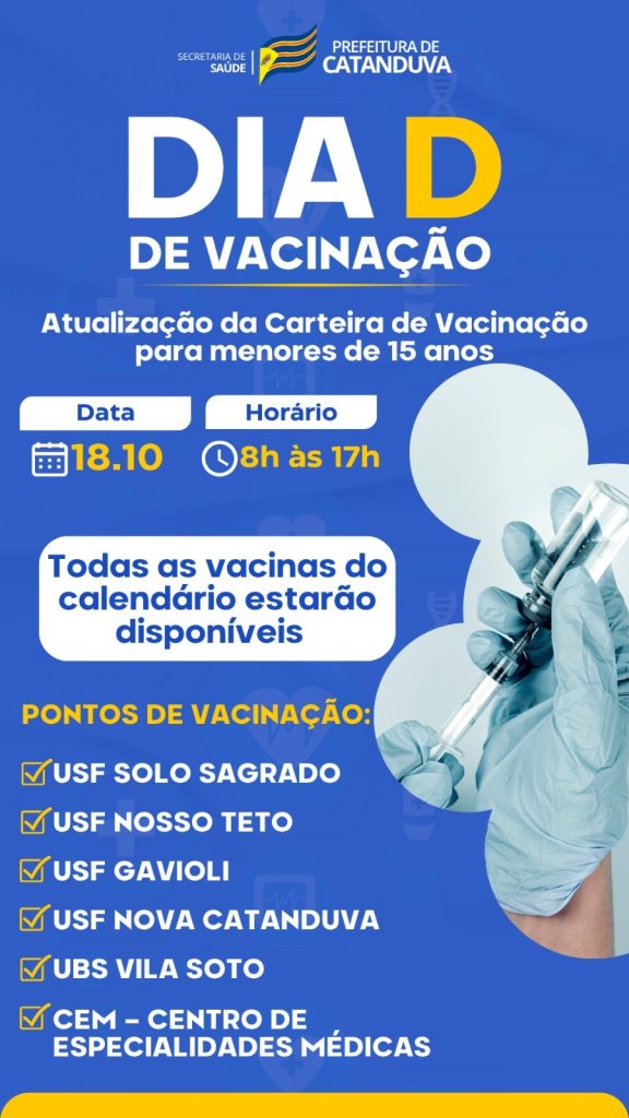 A Prefeitura de Catanduva, por meio da Secretaria Municipal de Saúde, realiza no próximo sábado, 18 de outubro, o Dia D da Campanha Nacional de Multivacinação, com foco em crianças e adolescentes de 0 a menores de 15 anos.