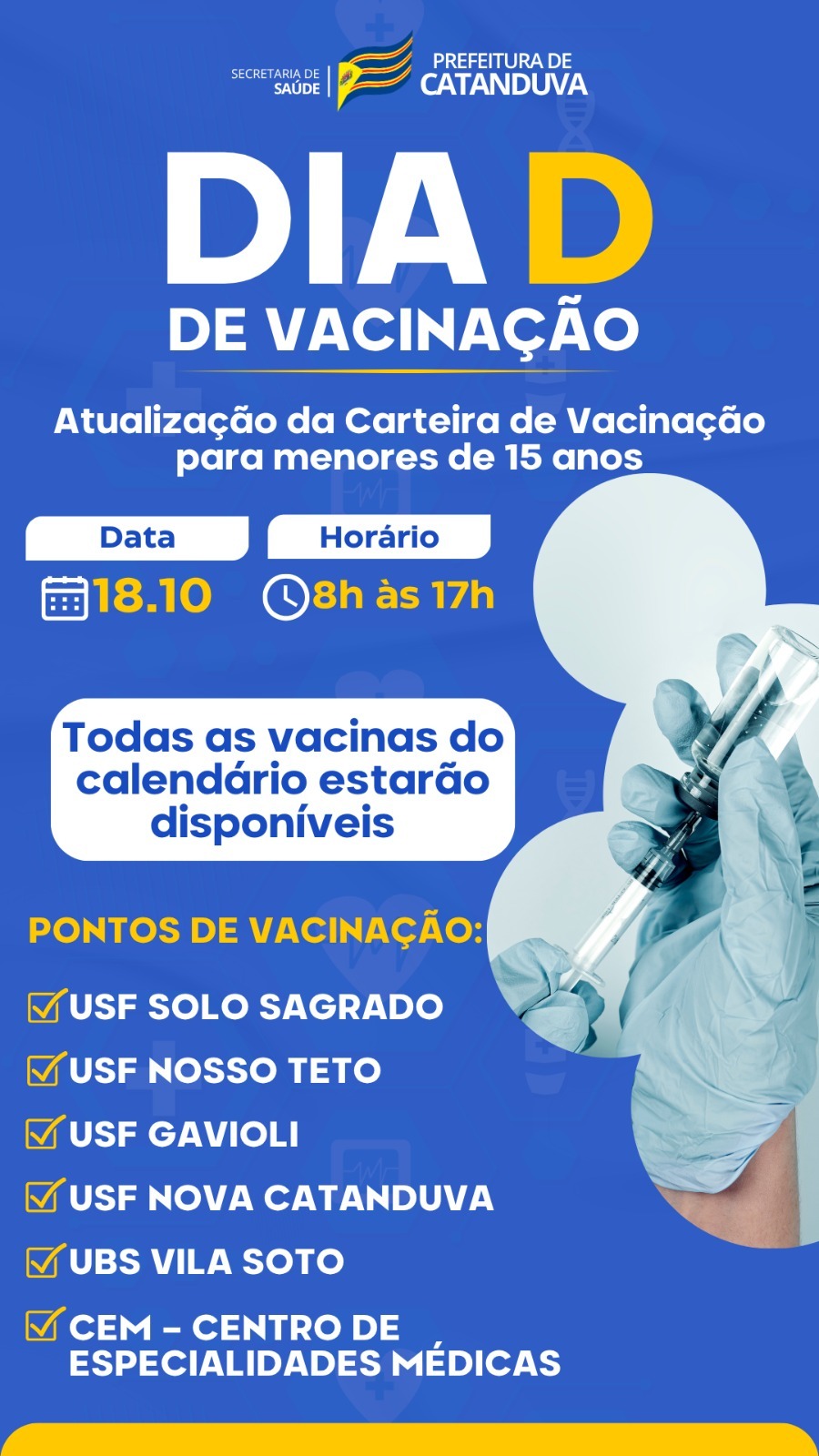 A Prefeitura de Catanduva, por meio da Secretaria Municipal de Saúde, realiza no próximo sábado, 18 de outubro, o Dia D da Campanha Nacional de Multivacinação, com foco em crianças e adolescentes de 0 a menores de 15 anos.