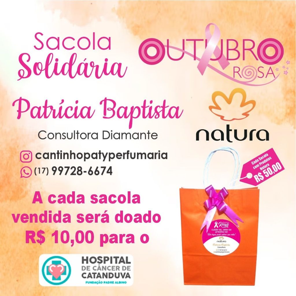 Cada sacola é vendida por R$ 50 e contém produtos diversos da Natura. Do valor total, R$ 10 de cada venda será revertido ao Hospital de Câncer de Catanduva (HCC), contribuindo para o tratamento dos pacientes oncológicos.