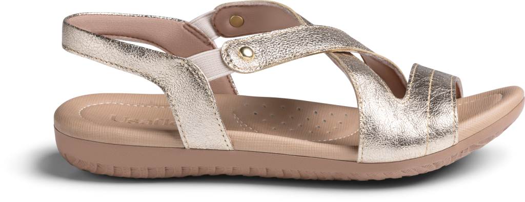 A linha aposta em tons dourados e prateados, marcados pelo efeito craquelado luminoso, que adiciona profundidade e brilho suave às composições. O resultado são modelos que valorizam o caminhar leve, permitindo que cada mulher celebre com liberdade, sentindo menos o sapato e mais a vida e os momentos.