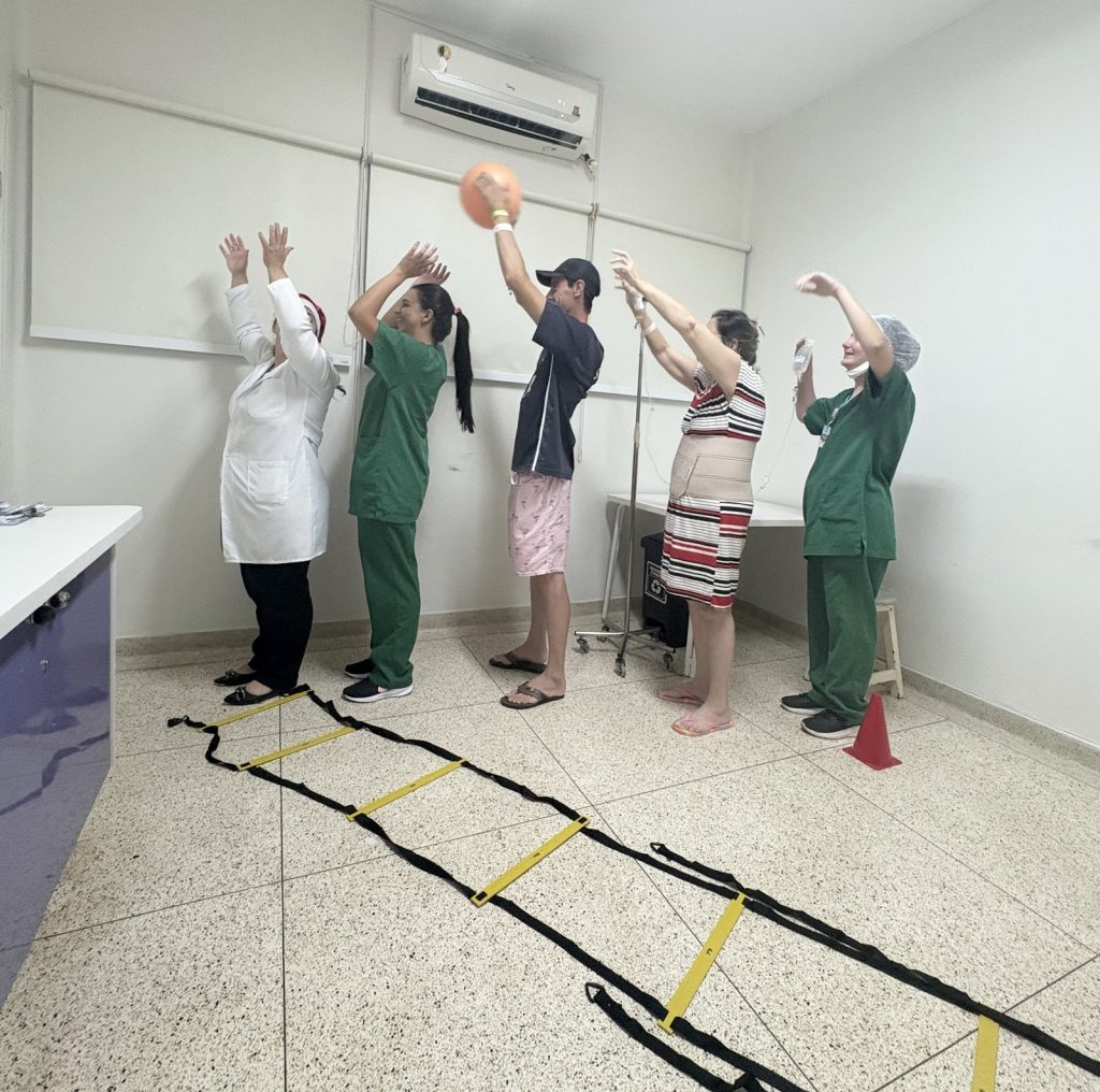 Durante a atividade, a equipe de Fisioterapia promoveu um circuito funcional temático, chamado Trenó do Fortalecimento, com uso de escada de agilidade, cones e bolas, ao som de músicas natalinas. O objetivo foi estimular força muscular, trabalho em equipe e resiliência mental, proporcionando um momento de descontração e motivação aos pacientes internados.