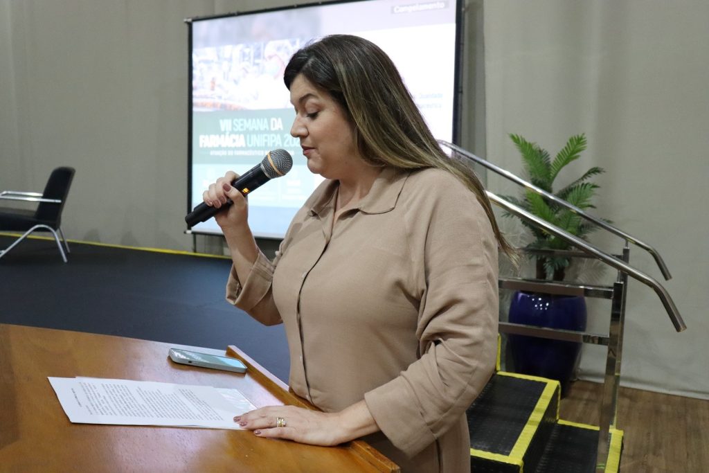 Abrindo a Semana, a coordenadora do curso de Farmácia, Profa. Ma. Roberta Zancheta Viola, destacou a importância do encontro como espaço de integração entre a formação acadêmica e os desafios do setor farmacêutico.