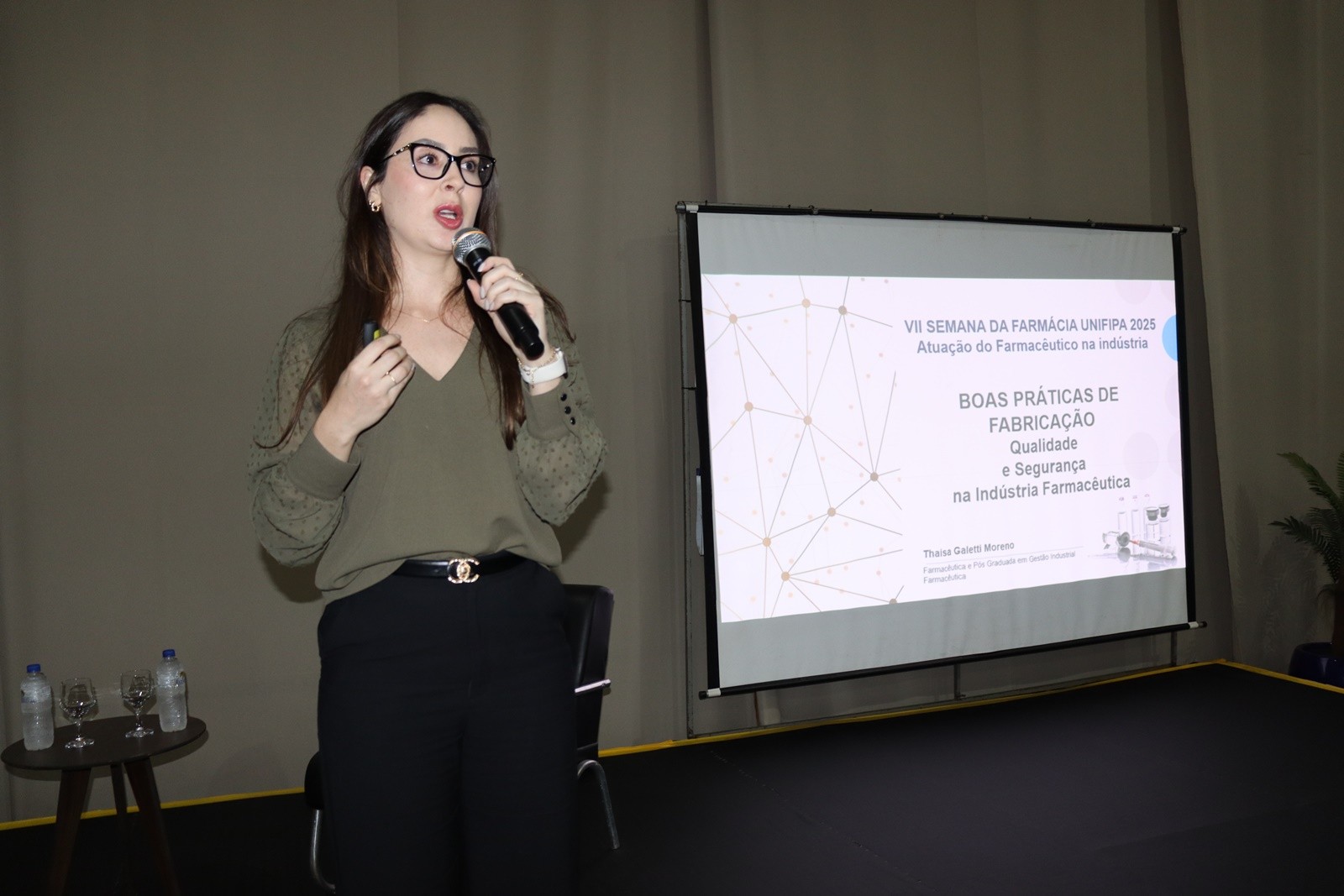 Na primeira fala a farmacêutica Thaísa Galetti Moreno, formada pela Universidade Estadual de Londrina (UEL) e pós-graduada em Gestão Industrial, abordou o tema “Boas práticas para a qualidade e segurança na indústria farmacêutica”. Com mais de 10 anos de experiência na área de controle e qualidade e atualmente coordenadora de Garantia da Qualidade na DLA Pharma, Thaísa ressaltou a importância do farmacêutico em todas as etapas de fabricação de medicamentos. “Meu objetivo é mostrar as boas práticas de fabricação e todos os controles que existem na indústria farmacêutica desde o início das etapas produtivas até a certificação final. Tudo isso envolve a atuação do farmacêutico, que além de garantir a qualidade se torna o responsável direto pelo sucesso ou por possíveis riscos que possam ocorrer”, destacou.