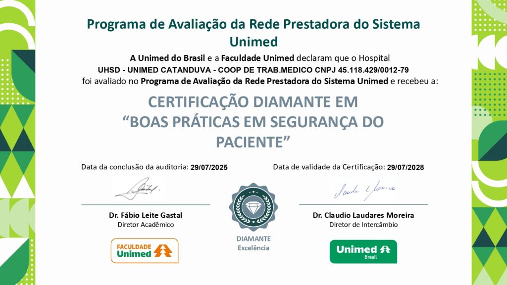 Para o presidente da Unimed Catanduva, Dr. José Renato Pizarro, essa conquista é coletiva. “O certificado Diamante – Excelência representa o empenho de toda a equipe do HUSD. É o reflexo do nosso jeito de cuidar, sempre buscando oferecer um atendimento de excelência e centrado no paciente. Essa conquista é de cada colaborador, médico cooperado e parceiro que acredita em nossa missão”, afirma.