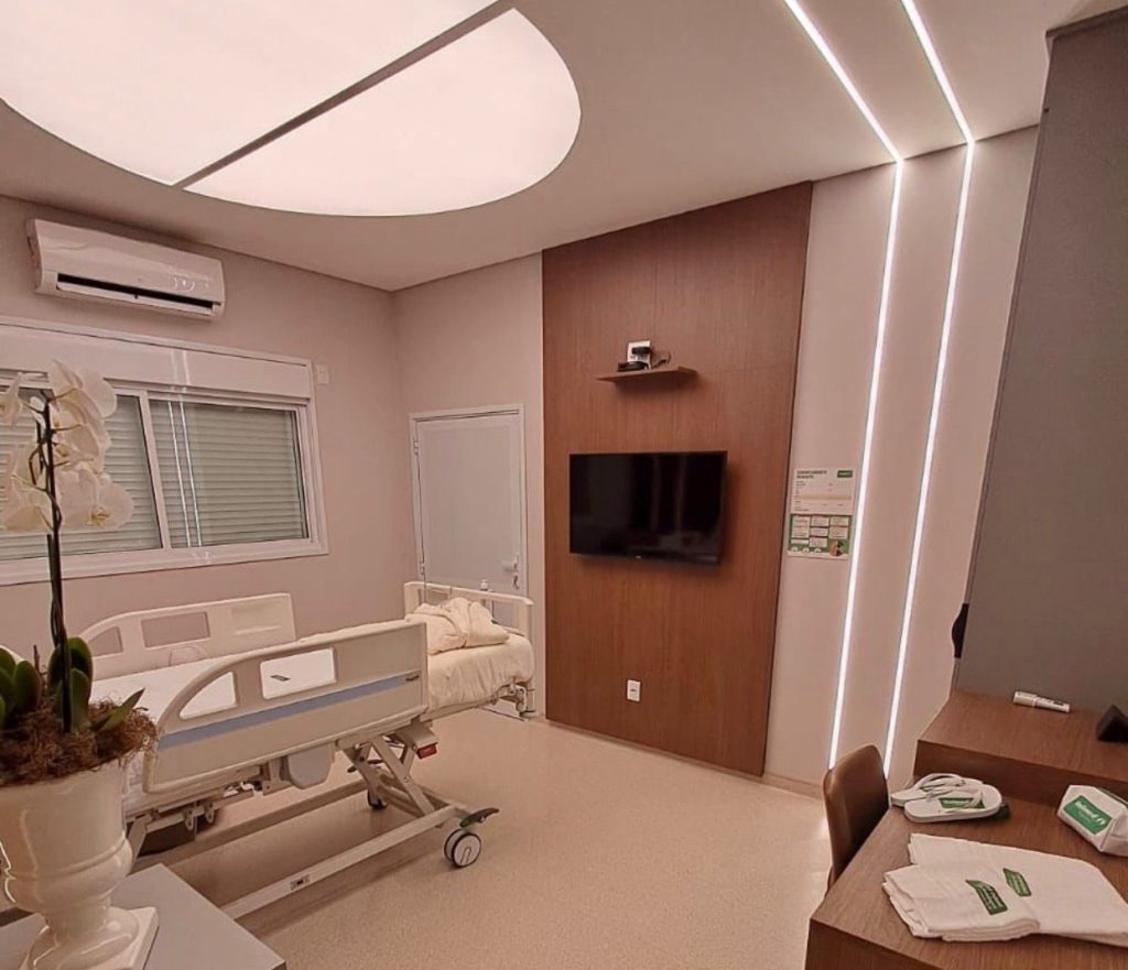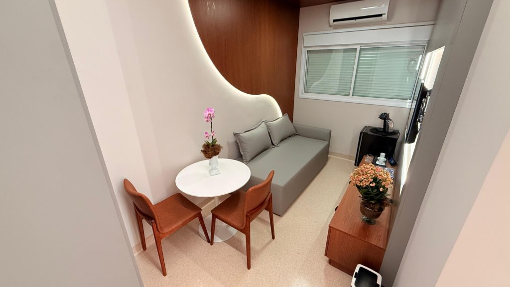 O ambiente conta com sete quartos e 10 leitos, incluindo Suíte Master com sala privativa e um quarto PPP (pré-parto, parto e pós-parto) equipado com banheira de hidromassagem, automação por Alexa para controle de luz, som e persianas, bola de pilates e banco de parto. Todos os quartos oferecem banheiro privativo, climatização quente e fria, isolamento acústico, Smart TV de 43 polegadas, frigobar retrô e persianas blackout automatizadas, além de Wi-Fi de alta performance.