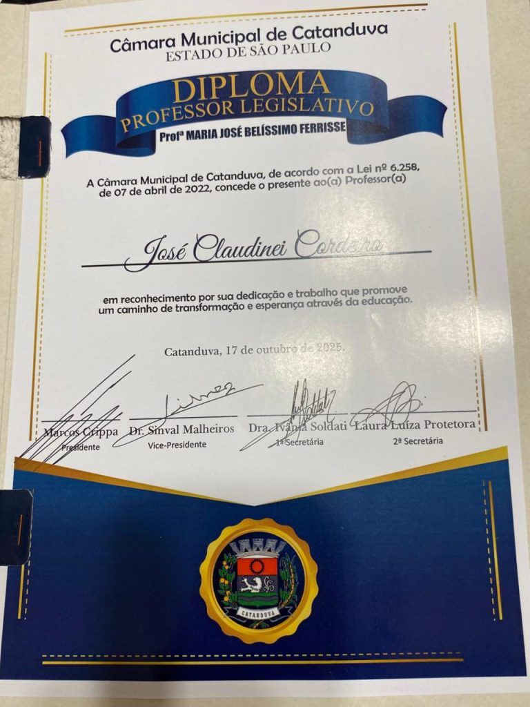 No dia 17 de outubro a Câmara Municipal de Catanduva realizou a solenidade de entrega do Diploma Professor Legislativo “Profª Maria José Bellíssimo Ferrisse” em reconhecimento ao trabalho de educadores do município. A homenagem foi instituída pela Lei Municipal nº 6.258/22, de autoria do vereador Gleison Begalli, e faz parte das comemorações alusivas ao Dia do Professor, celebrado em 15 de outubro.