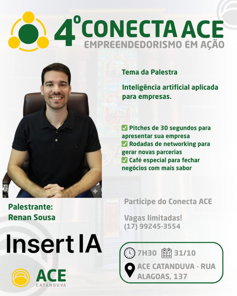 Além da palestra, o Conecta ACE conta com pitchs de 30 segundos, networking e café de relacionamento.