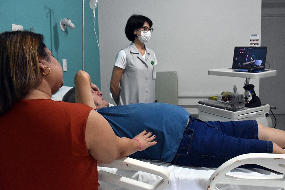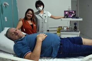 Prestes a receber alta hospitalar, o paciente José de Freitas, 78 anos, acompanhado da filha Ana Maria Freitas, recebeu o atendimento e se emocionou muito com a canção escolhida por ele mesmo: Estrelinha (Di Paullo e Paulino com Marília Mendonça).