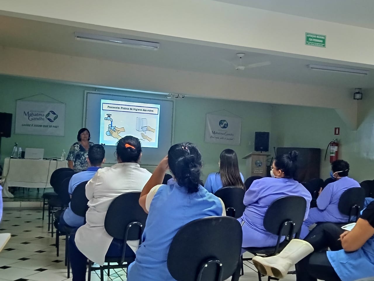 No último dia 28 de março, no auditório do Hospital Mahatma Gandhi, foi ministrado treinamento sobre Segurança do Paciente para a equipe multiprofissional daquele hospital pela Profa. Dra. Maristela Magri, docente responsável pela Liga de Segurança do Paciente, e pela Profa. Ma. Luciana Braz de Oliveira Paes, coordenadora do curso de Enfermagem da Unifipa.