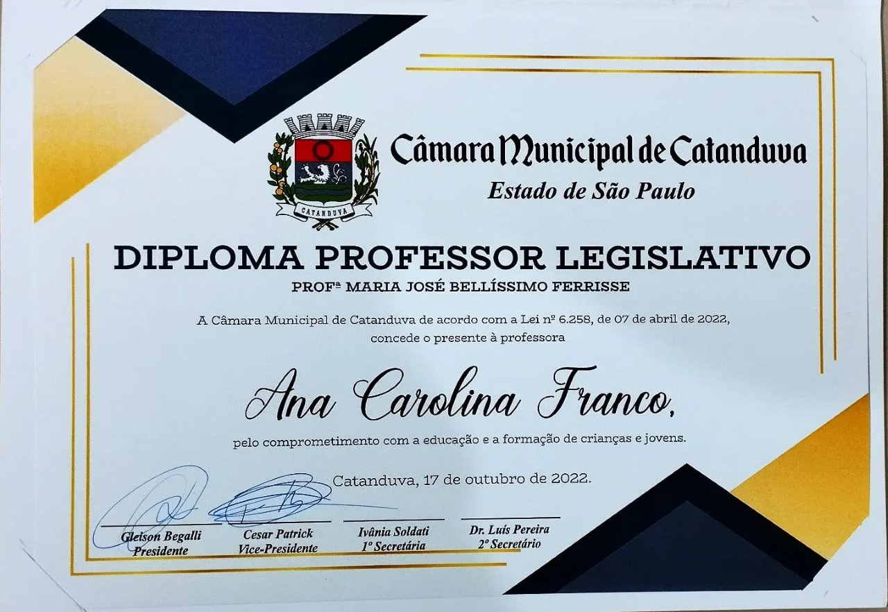 No dia 17 de outubro foi realizada no Teatro Municipal “Aniz Pachá” solenidade comemorativa para entrega do Diploma Professor Legislativo “Profª Maria José Bellíssimo Ferrisse”, que institui o “Dia do Professor” em Catanduva e inclui a data no calendário oficial do Município.