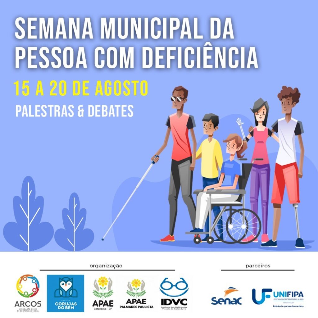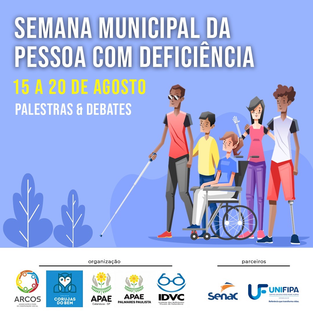 No próximo dia 15 de agosto será realizada a “Semana municipal da pessoa com deficiência”, organizada pela ARCOS, Corujas do Bem, APAE Catanduva, APAE Palmares Paulista e IDVC (Instituto de Deficientes Visuais de Catanduva), em parceria com o Centro Universitário Padre Albino/UNIFIPA e SENAC.