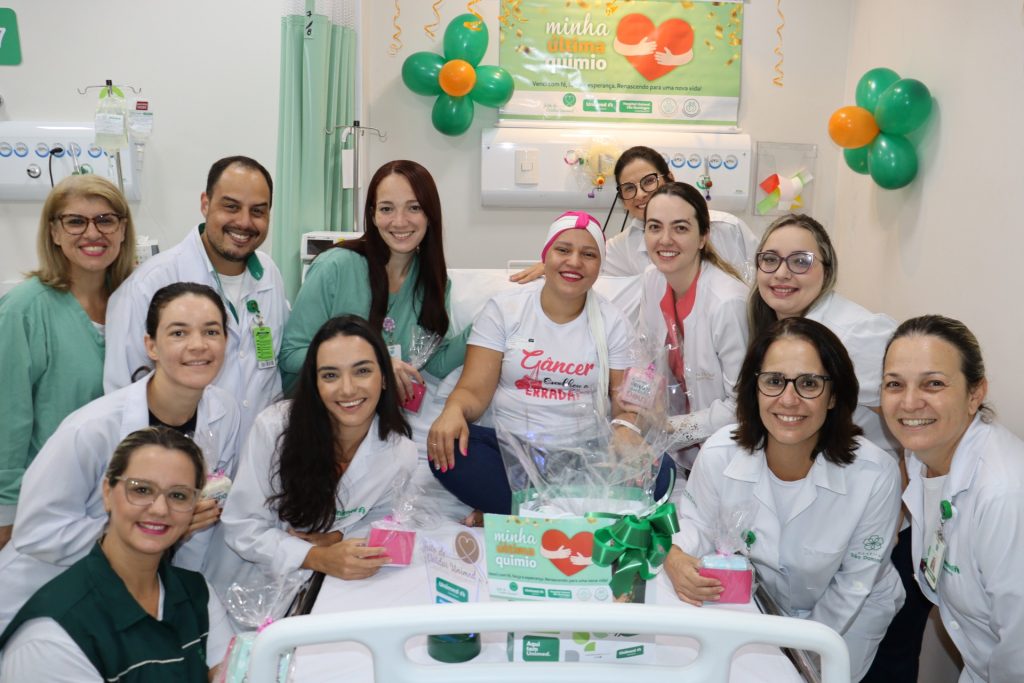 A ação contou com um corredor formado por colaboradores, que receberam a paciente com bexigas e mensagens de carinho, além de uma decoração especial na sala de medicação e a entrega de um presente simbólico, celebrando o encerramento de uma etapa importante do tratamento.