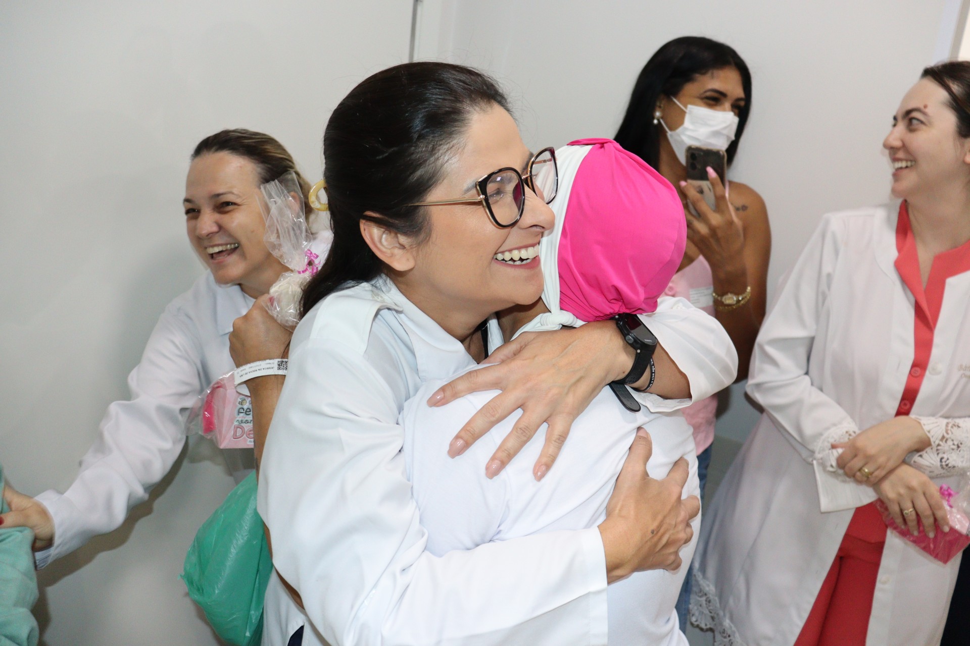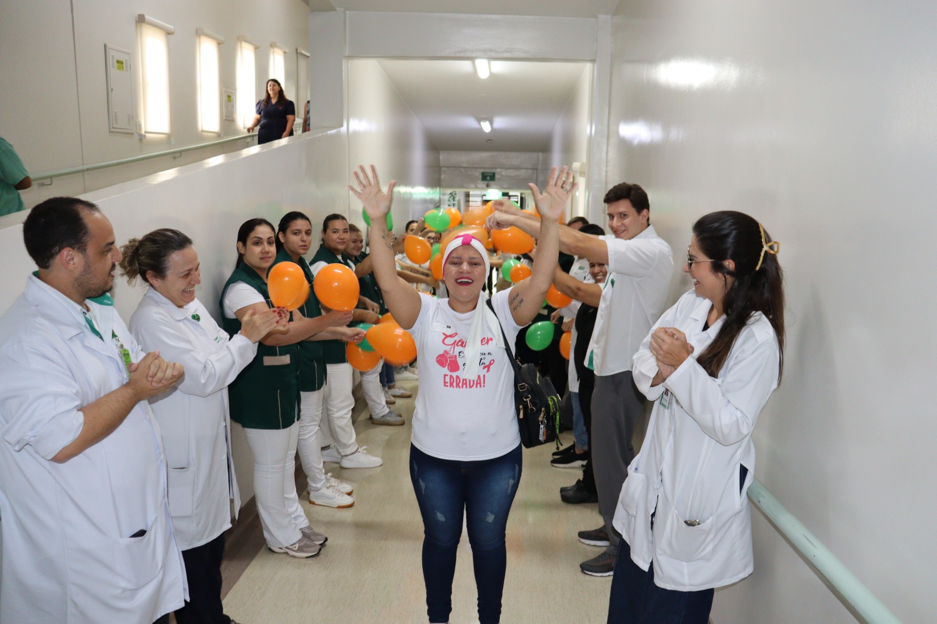 A ação contou com um corredor formado por colaboradores, que receberam a paciente com bexigas e mensagens de carinho, além de uma decoração especial na sala de medicação e a entrega de um presente simbólico, celebrando o encerramento de uma etapa importante do tratamento.