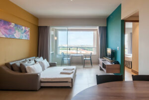 Fica a dica: dá para ir com a família toda curtir as férias, pois os apartamentos dos resorts Enjoy comportam até sete (7) pessoas. E possuem configuração de um ou dois quartos, antessala com sofá-cama, cozinha americana equipada com frigobar e micro-ondas e varanda.