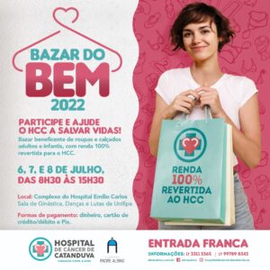 O Hospital de Câncer de Catanduva promove o Bazar do Bem de 6 a 8 de julho, das 8h30 às 15h30, no Complexo Esportivo da Unifipa. Serão vendidas roupas e calçados novos e 100% da renda revertida para custear o tratamento oncológico dos pacientes do HCC.