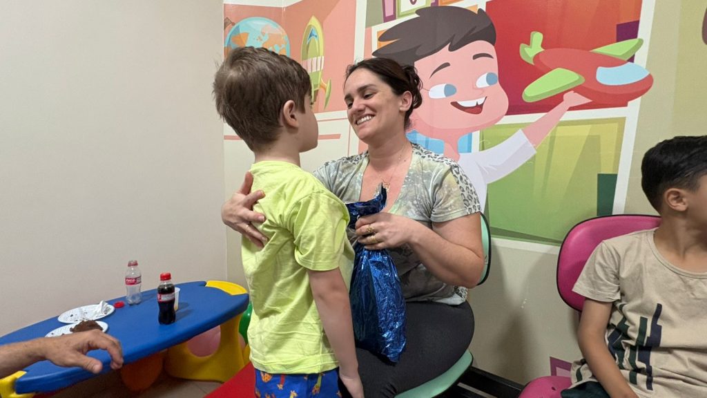 A celebração contou com entrega de presentes, lanche com cachorro-quente, esfirras, bolo de chocolate e algodão-doce, e a participação do grupo Dr. Sara & Cura, que animou a tarde com mágicas e brincadeiras proporcionando ambiente festivo e acolhedor às crianças e suas famílias.