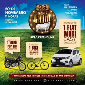 Juntamente com o leilão, como em todos os anos, haverá também o sorteio de um carro, uma moto e uma bicicleta, momento de grande expectativa no público, que também poderá acompanhar o evento pela internet no canal da APAE no Youtube ou pelas redes sociais da entidade. “O evento tem entrada gratuita e contamos com a presença de todos! Quem não puder contribuir arrematando gado, pode ajudar adquirindo a Ação Entre Amigos ou simplesmente consumindo nas barraquinhas”, completou Bottura.