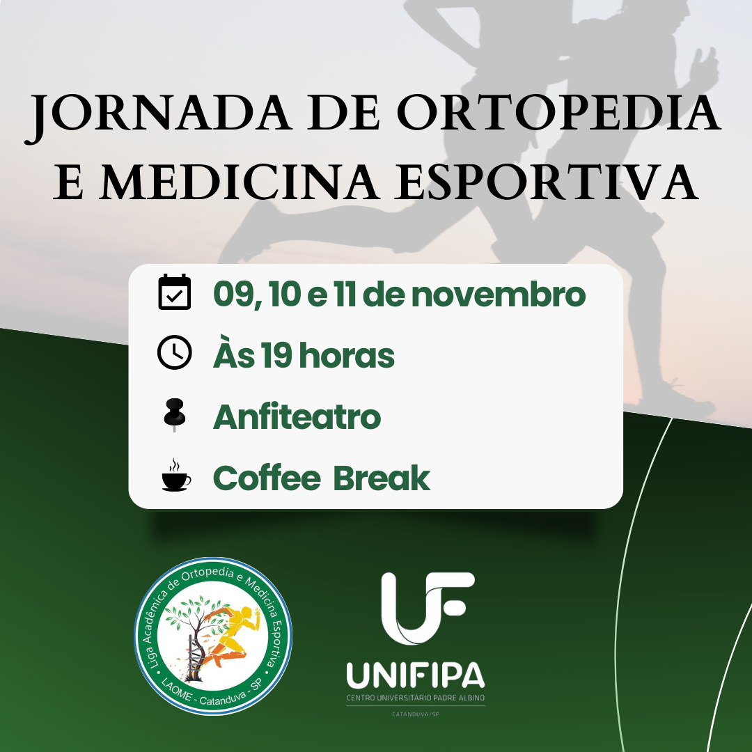 O curso de Medicina da Unifipa/Fameca promoverá nos dias 9, 10 e 11 de novembro, no Anfiteatro Padre Albino, a Jornada da Ortopedia e Medicina Desportiva 2022. O evento é organizado pela Liga Acadêmica de Ortopedia e Medicina Esportiva (LAOME) e com a participação da Liga de Radiologia e Diagnóstico por Imagem (LRDI) do curso.