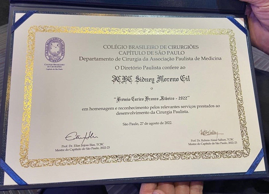 O cirurgião Sidney Moreno Gil recebeu o prêmio ‘Eurico Branco Ribeiro’, em reconhecimento pelos relevantes serviços prestados ao desenvolvimento da cirurgia paulista.