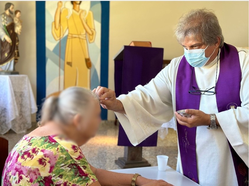 Demonstrando atenção especial às pessoas idosas institucionalizadas que não puderam comparecer à capela, o padre levou o vaso com as cinzas até elas, permitindo que todos recebessem a imposição e participassem desse momento de fé e espiritualidade.