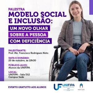 No próximo dia 20 de outubro, às 19h30, o Prof. Me. Francisco Rodrigues Neto ministra a palestra “Modelo social e inclusão: um novo olhar sobre a pessoa com deficiência” na sala D12 do Campus Sede da Unifipa. A palestra é promovida pelo NAP/ Núcleo de Apoio Psicopedagógico, através da área de “Apoio à Inclusão e Acessibilidade”.