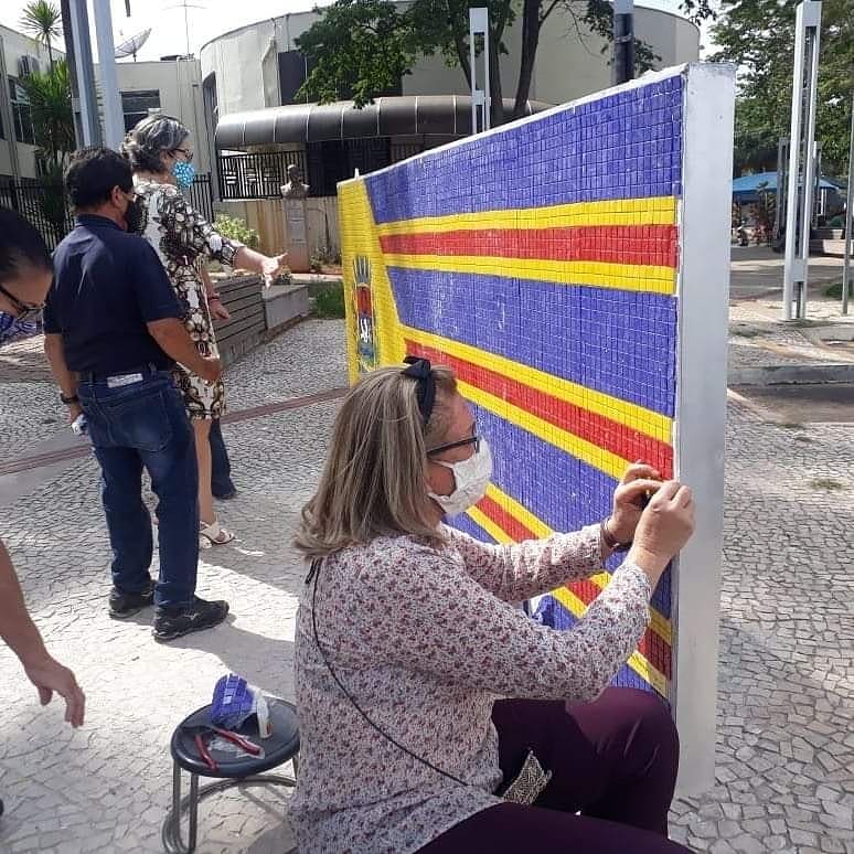 De quadradinho em quadradinho, se formou a bandeira! O Paço Municipal acaba de ganhar um mosaico especial que traz as cores que representam a nossa cidade. O trabalho no totem instalado na Praça Francisco Matarazzo foi idealizado pela Secretaria Municipal de Cultura, liderado pela arte-educadora Flávia Frigério que reuniu um grupo de alunos para a missão especial. Ao todo, foram 20 dias de atividades que terminaram com a instalação da bandeira em mosaico de três metros de largura por 1,22 de altura.