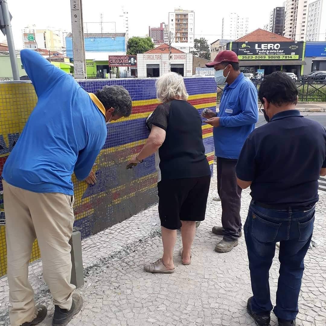 A montagem seguiu de forma minuciosa em um trabalho manual. “Fizemos tudo em três partes, porque o totem já está instalado no Paço Municipal. A partir daí dividimos a bandeira para encaixar no espaço. Agora vamos colocar um azulejo explicando sobre a gestão, sobre os mosaicistas e sobre a parceria. Nós montamos tudo para posteriormente finalizar esse trabalho com a explicação desse trabalho tão lindo”, complementa a arte-educadora.