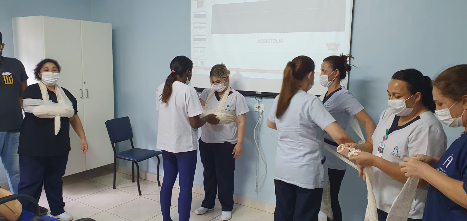 A capacitação contou com certificado emitido pelo SAMU e abordou parada cardiorrespiratória e trauma na pessoa idosa, com conteúdo teóricos, práticos, manobras de reanimação e imobilização