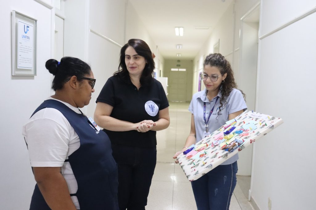 O curso de Psicologia da Unifipa realizou, no dia 24 de novembro, a ação “Cuidar é Doce”, criada com o objetivo de promover bem-estar emocional, fortalecer vínculos e reconhecer o trabalho dos colaboradores da instituição ao longo do ano. A ação homenageou equipes de diferentes setores, como reitoria, tesouraria, jurídico, gestão de negócios, secretarias de curso, manutenção, tecnologia da informação, central de relacionamento ao cliente, biblioteca, inspetores de alunos, limpeza, café e gestores de curso. Segundo o curso, a proposta foi agradecer a dedicação e o apoio oferecido por todos no cotidiano acadêmico e administrativo.