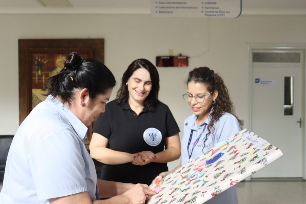 A coordenadora do curso de Psicologia, Profa. Dra. Luciana Calza, e a secretária do curso, Alessandra Silva dos Santos, participaram da ação distribuindo os doces acompanhados das frases. De acordo com Luciana, iniciativas como essa contribuem para fortalecer o clima institucional, valorizando o cuidado e o reconhecimento no ambiente de trabalho.