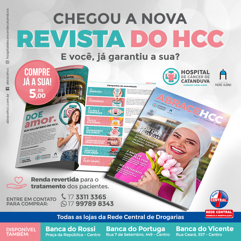A Revista Comemorativa dos 2 anos do Hospital de Câncer de Catanduva está disponível para venda por R$ 5 na Banca Rossi, na Praça da República; na Banca do Portuga, na rua Sete de Setembro, 449; na Banca do Vicente, na rua Ceará, 357; e em todas as farmácias da Rede Central.