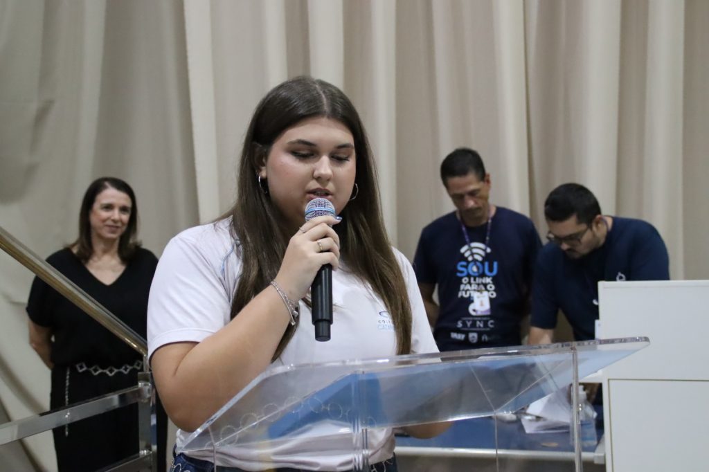 Representando os estudantes a aluna Maria Clara Lopes agradeceu os docentes, enfatizando o papel fundamental dos professores no processo de aprendizagem. “Vocês foram muito mais do que educadores; foram guias, exemplos e inspiração”, afirmou, destacando o incentivo, a paciência e o apoio recebidos ao longo da formação.