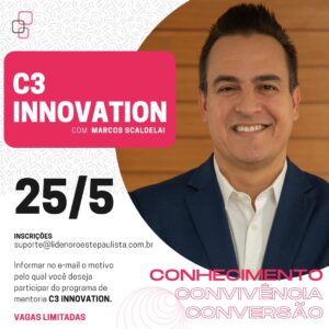 E vem aí mais uma grande novidade para os jovens empresários do grupo. Trata-se do C3 Innovation, um plano de desenvolvimento que tem o objetivo de criar um mapa de oportunidades de crescimento sustentável para as empresas dos filiados pelos próximos cinco anos. O projeto inovador foi arquitetado pelo próprio presidente do grupo, Marcos Scaldelai, e terá 18 encontros, a partir de 25/05, nos quais ele abordará tópicos diversos relacionados ao tema, além de expor toda sua vasta experiência como empresário, autor de livros e executivo de grandes companhias como Nielsen, General Mills, Vigor, Häagen-Dazs e Bombril – sendo, nesta última, eleito presidente aos 36 anos de idade.