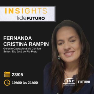 Já na segunda-feira seguinte (23/05), o LIDE Futuro promove um Insights com a gerente operacional do Comfort Suites São José do Rio Preto, Fernanda Cristina Rampin.