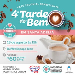 Acontece, no dia 13 de agosto, às 15 horas, a 4ª Tarde do Bem, promovida pelos Voluntários do Bem. O evento acontece no Buffet Espaço Teen, em Santa Adélia, e o valor da adesão é de R$ 60 com buffet livre. Na Tarde do Bem será servido café colonial e 100% da renda revertida ao Hospital de Câncer de Catanduva/HCC.