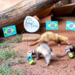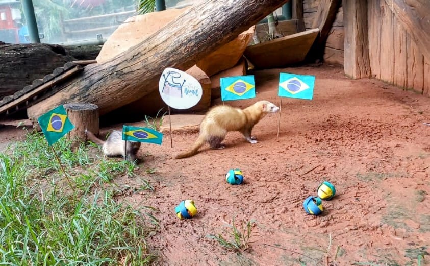 Outros animais, como os furões, não ficaram de fora! Essa espécie, que adora brincar e descobrir coisas novas, recebeu bolinhas feitas com tirinhas pintadas à mão pela equipe do zoo, recheadas com mamão.