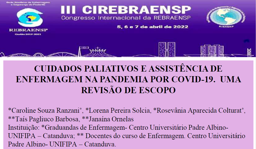 Dois Trabalhos de Conclusão de curso da Enfermagem do Centro Universitário Padre Albino/Unifipa de 2021 foram apresentados no 3º CIREBRAENSP – Congresso Internacional da Rede Brasileira de Enfermagem em Segurança do Paciente, que aconteceu de 5 a 7 de abril passado.