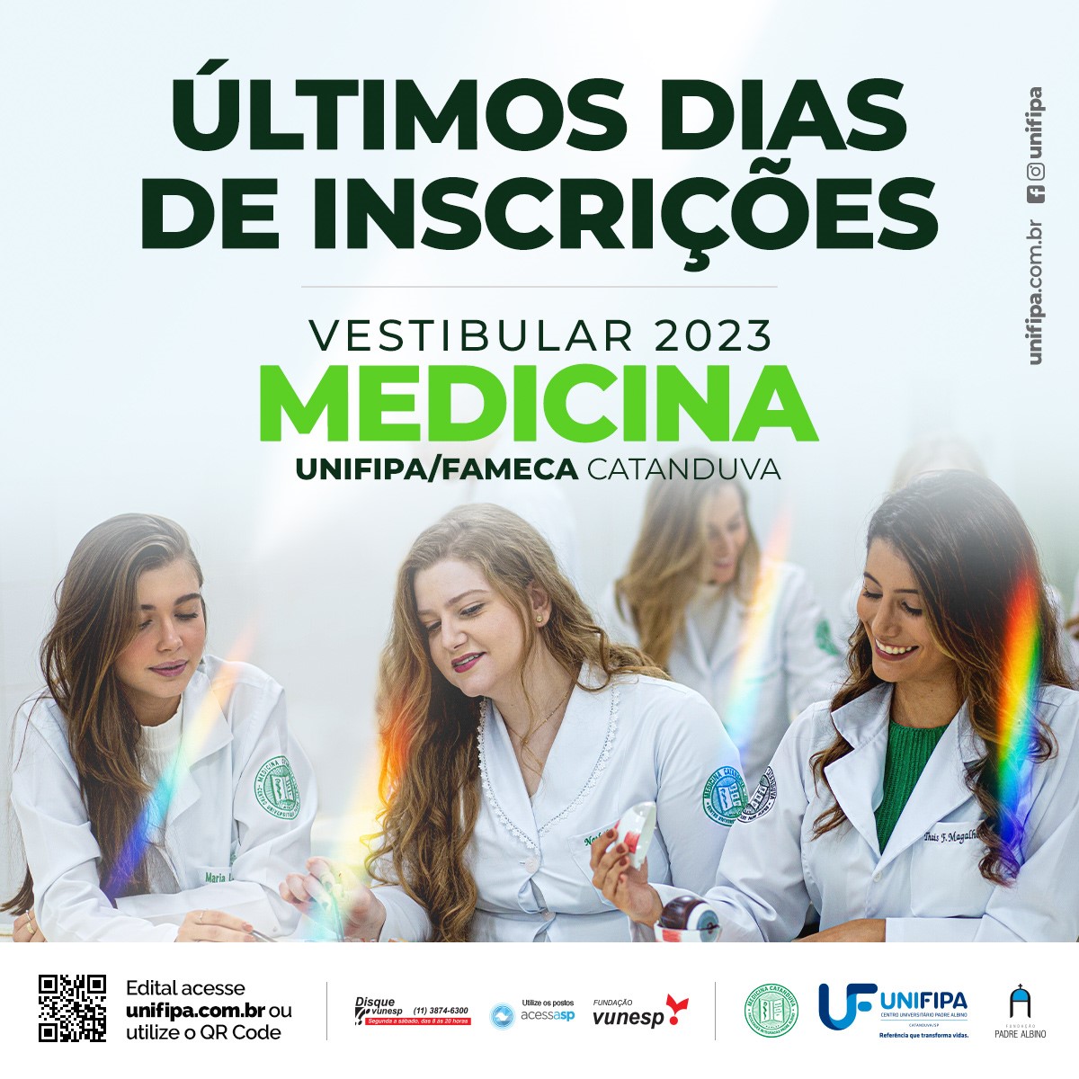 No próximo dia 16 de novembro, às 23h59, terminam as inscrições do vestibular de 2023 do curso de Medicina da FAMECA/Unifipa. O curso tem duração de seis anos e 100 vagas são oferecidas no período integral. As inscrições podem ser feitas exclusivamente pela internet, através do site www.vunesp.com.br, mediante o preenchimento da ficha de inscrição e do pagamento da taxa no valor de R$ 400, que pode ser efetuado por boleto bancário, em qualquer agência. O prazo para o pagamento do boleto expira no dia 17.