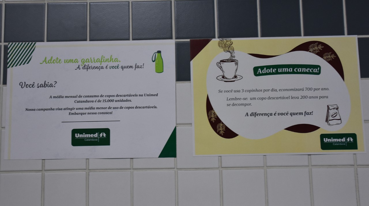 Pelas paredes da Unimed Catanduva, próximo ao cantinho do café e da água, foram afixados cartazes com curiosidades e conscientização sobre a importância de fazer a diferença ao gerar menos impacto ao meio ambiente. O projeto convida o colaborador a pensar que ele é fundamental para a diminuição do consumo e preservação do meio ambiente, mas também reforça o cuidado com a saúde.